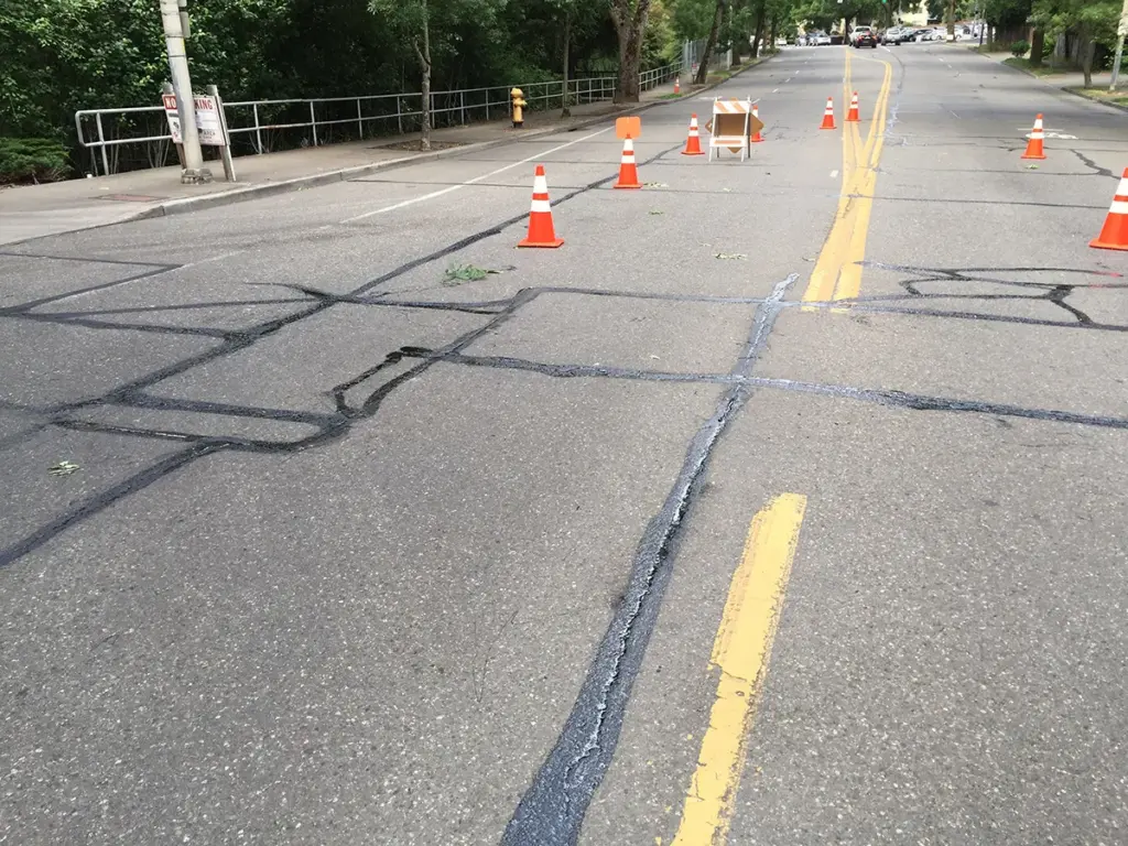 Professional crack sealing protecting asphalt from water damage and deterioration.